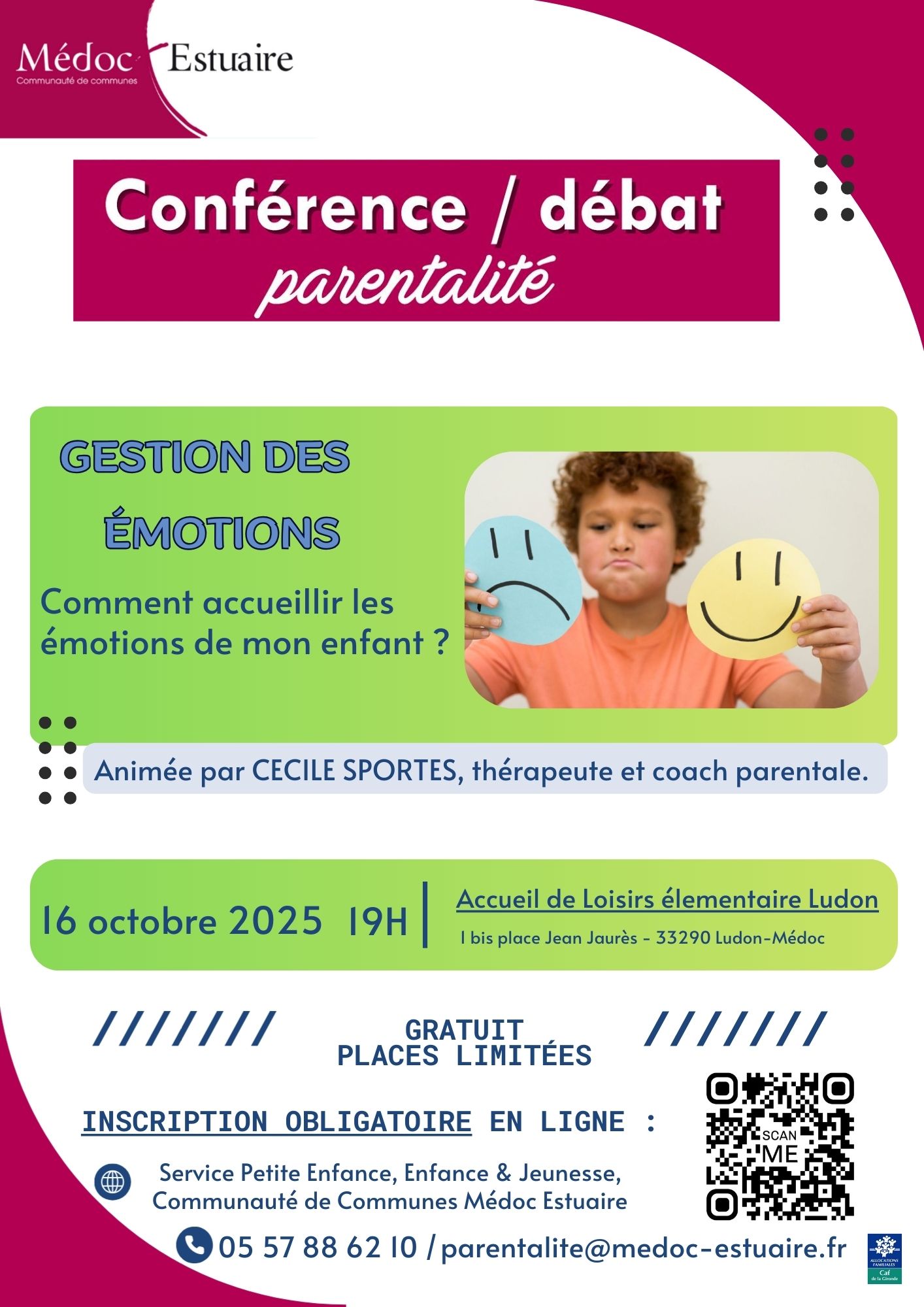 Dans la continuité des actions en faveur de l’accompagnement à la parentalité initiées en 2021, la Communauté de Communes organise à nouveau une soirée conférence parentalité sur la thématique de la gestion des émotions, le 16 octobre à 19h (ALSH élémentaire Ludon Médoc).